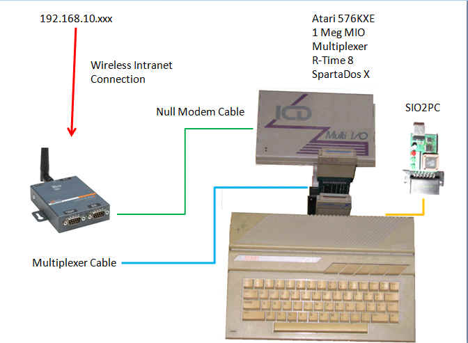 This is a basic Atari Slave Configuration. Farther down is the configuration I use. the single one piece of equipment that allow the Atari to connect to the internet is the Lantronix devices. I use 3 different Lantronix devices. I use a WIBOX, MSS100, and MSS4. Should you decide to get your own Lantronix Device I recommend the WIBOX the WIBOX and MSS4 are still supported by Lantronix. Next I have an AtariMax USB SIO2PC attached to each Atari Slave. I have a secondary network where each of my APE devices have the same ATR mapped on my PC fileserver that also runs my WEB Site.