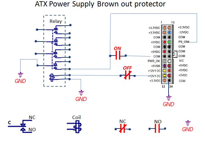 Brown out protector are designed to protect computer hardware from power flickers where you have less than a blink of the eye. Should the power drop the relay coil will become de-energized which kills all power. If the computer loses power the circuit requires the user to press the start button. By protecting the computer from brown outs you stand a lot better chance of scrambling a hard disk or corrupted memory.