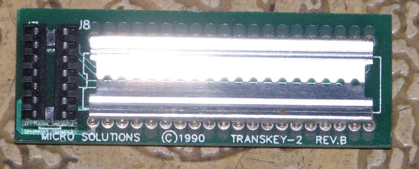 TransKey (TK1), a small microprocessor based keyboard interface board, connects an IBM type keyboard to your Atari 8-bit system. TK is mounted inside your 400/800/XL/XE computer and the original keyboard retains full functionality whether the IBM keyboard is connected or not. With the recent 2.4 upgrade ROM, you can now enter macros (key sequences) from the keyboard. The ZRAM option ($13 extra) will retain those macros in memory even while your system is not powered. The basic solder-in (14 total solder connections) version of TK is $47.00, while a version with a PoKey piggy-back board is $10.00 more and reduces your work to four solder connections. TK is manufactured by DataQue Products, Post Office Box 134, Ontario, OH 44862 (USA).